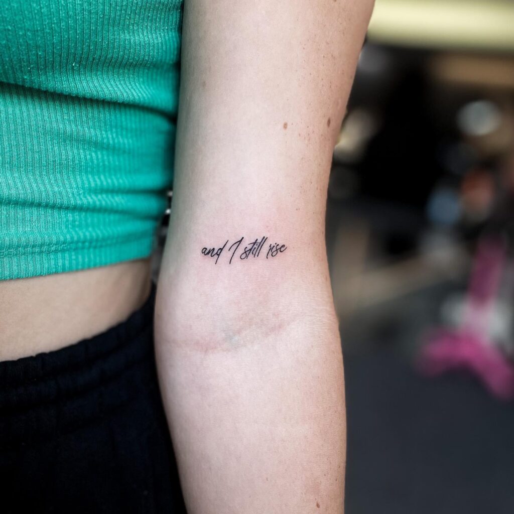 This elegant tattoo features the phrase “and I still rise” in a delicate, slightly slanted script. The fine lines and modest size give it a poetic softness, while the wording carries undeniable strength. Positioned on the arm, it remains visible yet understated.